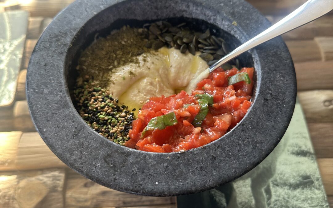 Schep de hummus in een ondiepe schaal en garneer met de sesamzaadjes, pompoenpitten, Za’atar en eventueel wat wasabi-sesam. Lepel er een paar flinke eetlepels van de Salsa Cruda over en maak het af met een druppeltje olijfolie.